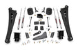 s equipped with either factory rear coils or factory rear air ride suspension. On Air Ride models, this kit uses a rear air bag spacer that works with the factory air bag to provide rear lift. This kit also features a Rear Sensor Arm Relocation Bracket that can modify how the sensor link speaks to the computer to determine what the ride height is. This allows you to adjust the amount of rear height up to 1-inch higher than the front by way of multiple mounting points spaced by 1/4-inch. Pick the mounting point you want for the rear ride height you prefer. When changing a vehicle's suspension, the key to preserving ride quality is in keeping the geometry of all suspension components as close to their factory angles as possible. Rough Country's new 5-inch Suspension kit features a set of ultra-durable Radius Arms, precision fit to bolt right into the factory mounts for an easier install and a more factory-like angle. These beefy, upgraded Radius Arms also feature a durable, durable rubber bushings for maximum vibration absorption. In a further effort to preserve the truck's factory ride, this kit retains the factory progressive rate coil spring -- designed by Dodge specifically for the weight and ride quality of these new model trucks.