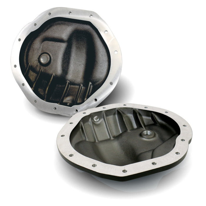 Front Cover fits AA 14-9.25; Rear Cover fits AA 14-11.5; Cast Aluminum Internal and external cooling fins; Separate fill and drain ports; Magnetic drain plugs; Stainless steel allen head cap bolts and fill plugs; Engineered cover design keeps oil on the gears (Rear); Deflects oil back onto the ring gear and into the pinion gear for cooler longer life (Rear); Extra capacity sump located at bottom for gears to pick up oil (Rear); Gasketless cover has integral re-usable Viton O-Ring (Rear)